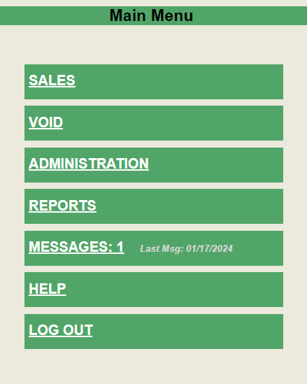 - Administration - Enables you to add and maintain clerk information, set and change passwords, and order and track stock or inventory items. See "Managing Clerk Information".